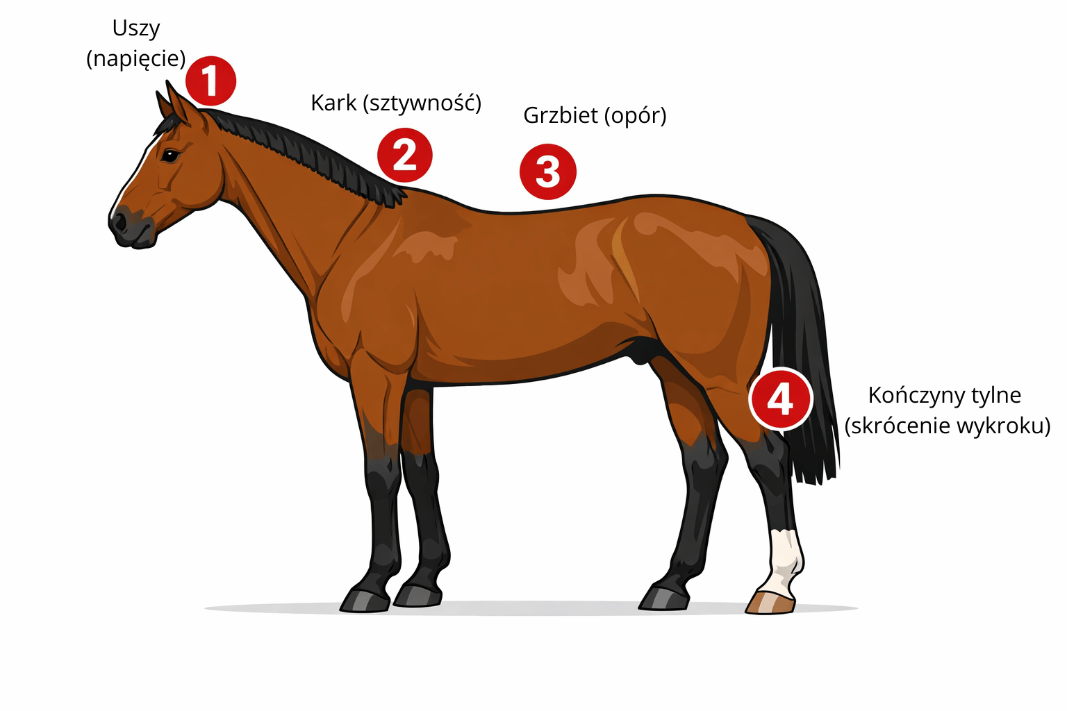 - sztywność na początku treningu – koń potrzebuje dłuższej rozgrzewki,